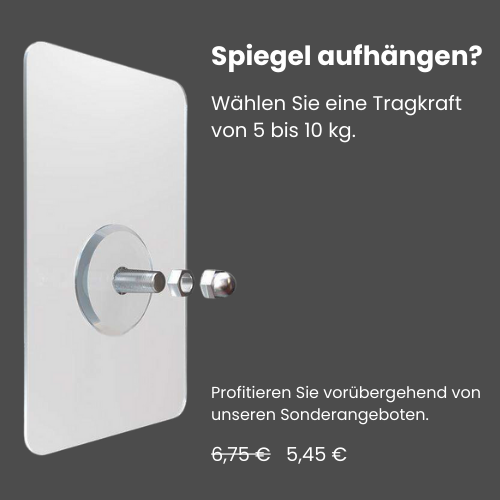 Unsere Klebenägel machen es sehr einfach, einen Spiegel an der Wand zu befestigen, ohne bohren zu müssen. Wir empfehlen, die selbstklebenden Nägel mit einer Tragkraft von 5 kg pro Stück zu verwenden. Planen Sie, einen Spiegel im Badezimmer aufzuhängen? Dann ist es ratsam, unsere wasserdichten Klebenägel mit 5 kg Tragkraft zu wählen. Zudem ist es gut zu wissen, dass unsere Nägel nicht nur zum Aufhängen von Spiegeln ohne Bohren geeignet sind, sondern auch für Regale, Bilder, Bilderrahmen und vieles mehr.